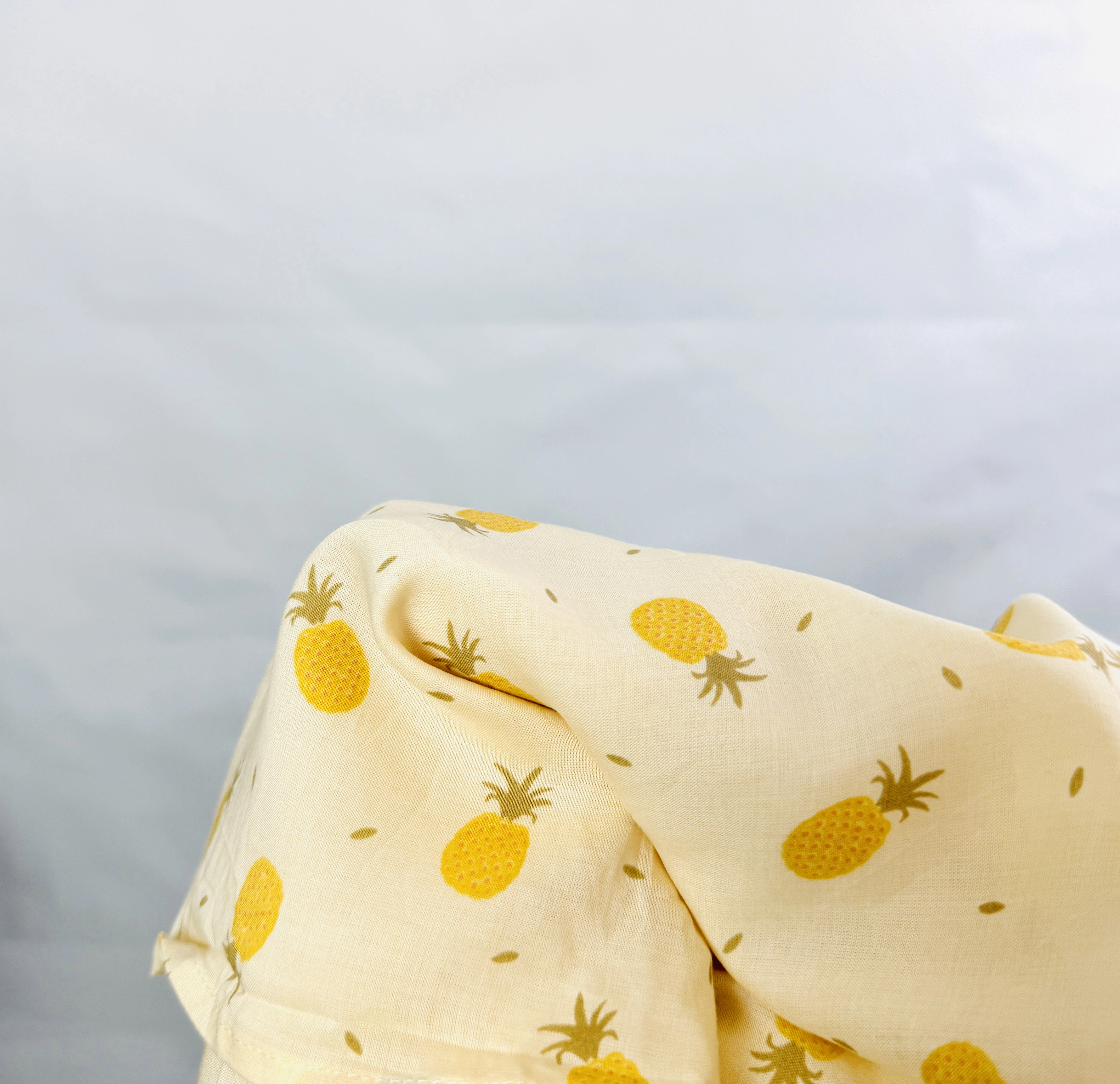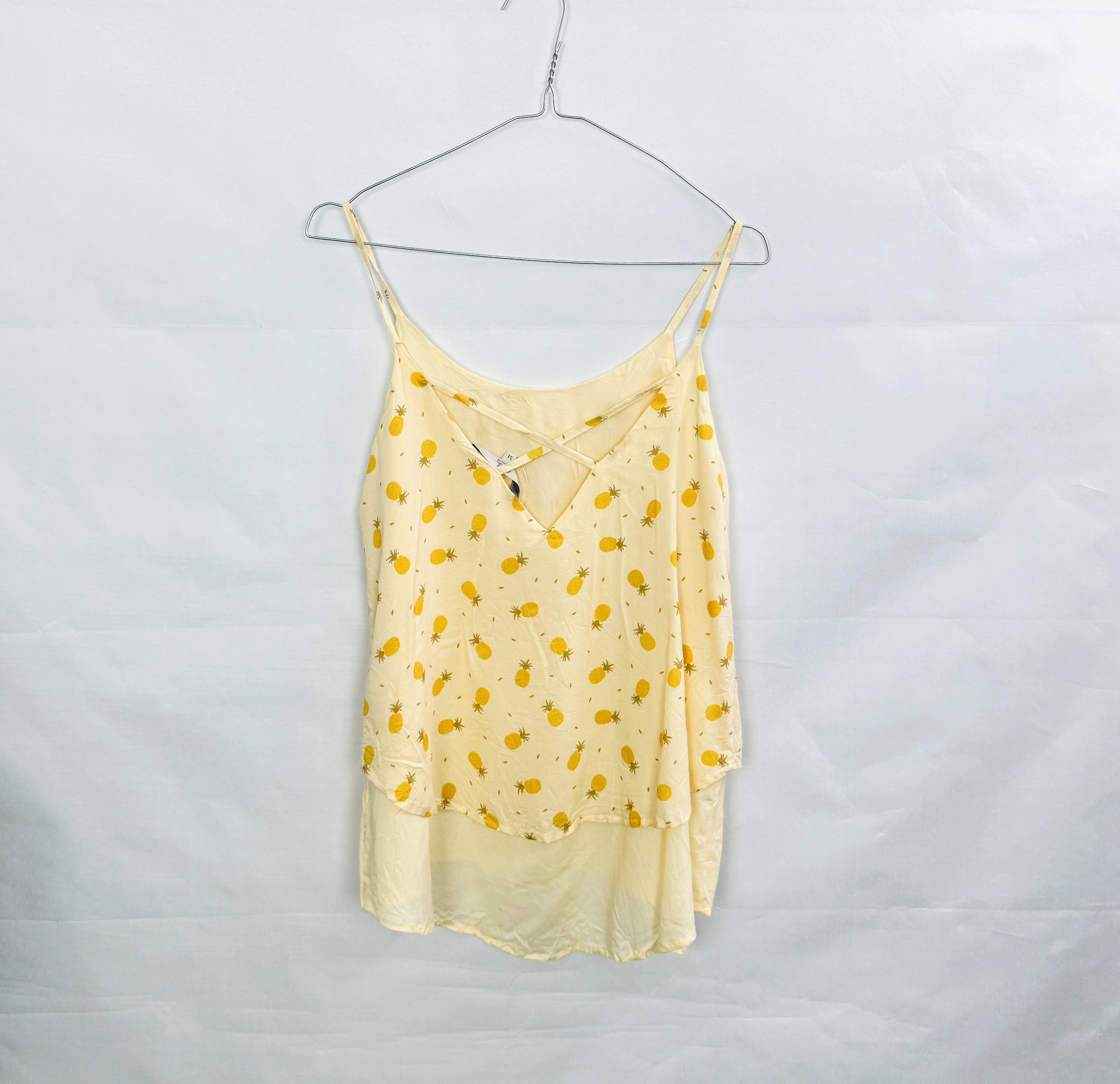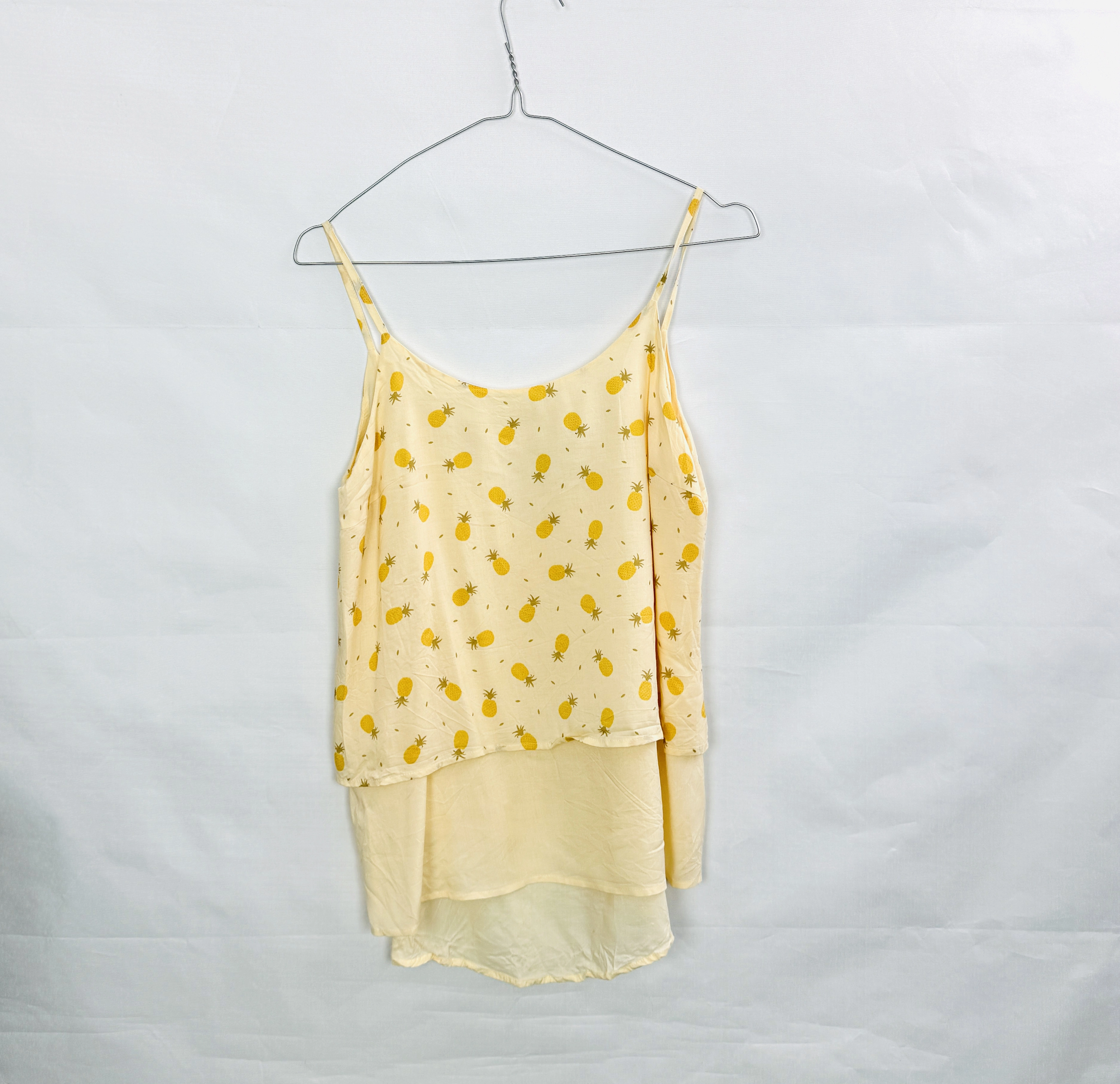 Ten słoneczny top to kwintesencja radosnego, wakacyjnego nastroju i bezpretensjonalnej, kobiecej swobody. Delikatny, jasnożółty odcień tkaniny, przywodzący na myśl ciepłe promienie słońca, stanowi idealne tło dla regularnego wzoru drobnych ananasów, które nadają całości figlarnego i niezwykle modnego charakteru. To ubranie, które od razu wprowadza powiew świeżości do letniej garderoby, będąc doskonałym wyborem dla kobiet ceniących sobie lekkość, optymizm i naturalny wdzięk w codziennych stylizacjach. Top emanuje energią i pozytywnym klimatem, sprawiając, że każdy dzień nabiera tropikalnej lekkości, niezależnie od tego, czy spędzasz go w mieście, czy na piaszczystej plaży.